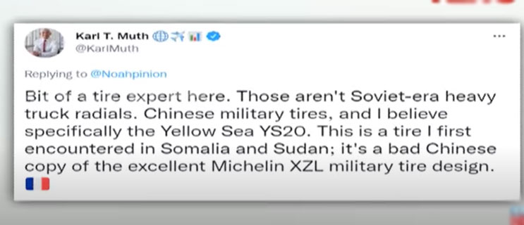 କେବଳ ସେତିକି ନୁହେଁ ବରଂ କାଦୁଅରେ ଫସି ରହିଥିବା ଋଷ ସେନାର ପ୍ୟାଣ୍ଟିର ଏସ୧ ମିଶାଇଲ ସିଷ୍ଟମର ଏକ ଫଟୋ ମଧ୍ୟ ଶେୟାର କରିଛନ୍ତି । ସେଥିରେ ସେ ଲେଖିଛନ୍ତି ଚୀନର ଶସ୍ତା ଟାୟାର ୟୁକ୍ରେନର ନରମ ମାଟିରେ ବିଫଳ ହୋଇଛି । ଆମେରିକାର ସରକାରୀ ପରାମର୍ଶଦାତା କାର୍ଲ ଟି ମୁଥ ମଧ୍ୟ ଟ୍ରେଣ୍ଟଙ୍କ ଦାବିରେ ସହମତି ପ୍ରକାଶ କରିଛନ୍ତି । ସେ ମଧ୍ୟ କହିଛନ୍ତି କି ଋଷ ଯୁଦ୍ଧ ଗାଡିରେ ଲାଗିଥିବା ଟାୟାରର କ୍ଵାଲିଟି ବହୁତ ଖରାପ । ଟାୟାର ଗୁଡିକ ଖୁବ ଶୀଘ୍ର ଘୋରି ହୋଇ ନଷ୍ଟ ହୋଇଯାଉଛି ।