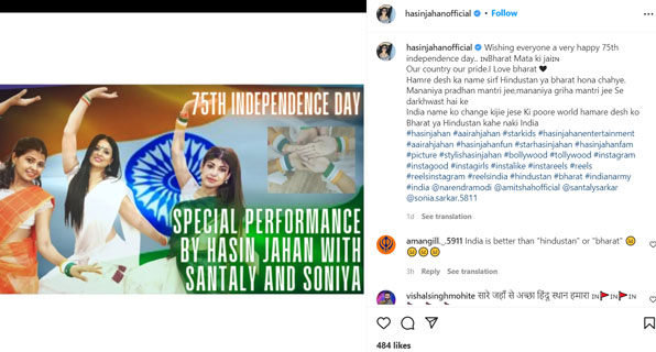 ଇନଷ୍ଟାଗ୍ରାମରେ ଏକ ଭିଡିଓ ଶେୟାର କରି ହସିନ ଜାହାନ ଲେଖିଛନ୍ତି କି, ଆମ ଦେଶ ଆମର ସମ୍ମାନ, ମୁଁ ଭାରତକୁ ଭଲ ପାଏ । ମାନ୍ୟବର ପ୍ରଧାନମନ୍ତ୍ରୀ ଏବଂ ସ୍ବରାଷ୍ଟ୍ରମନ୍ତ୍ରୀଙ୍କୁ ମୁଁ ଭାରତର ନାମ ପରିବର୍ତ୍ତନ କରିବାକୁ ଅନୁରୋଧ କରୁଛି । ଯାହାଫଳରେ ସାରା ବିଶ୍ଵ ଆମକୁ ଇଣ୍ଡିଆ ନୁହେଁ କି ଭାରତ ନୁହେଁ ବରଂ ହିନ୍ଦୁସ୍ଥାନ ବୋଲି କହିବ ।”