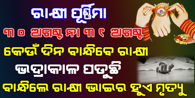 ହେଲେ ୩୦ ତାରିଖ ଦିନ ସକାଳ ୧୦ ଟା ୫୮ ମିନିଟ ଠାରୁ ଆରମ୍ଭ ହୋଇ ୩୧ ତାରିଖ ସକାଳ ୭ ଟା ୪୬ ମିନିଟରେ ସମାପ୍ତ ହେଉଛି । ତେଣୁ ଆପଣ ଅଗଷ୍ଟ ୩୦ ତାରିଖ ଦିନ ସାରା ଆରମରେ କୌଣସି ସମୟରେ ବି ରାକ୍ଷୀ ବାନ୍ଧି ପାରିବେ । ଏଥିସହ ଅନେକଙ୍କ ପ୍ରଶ୍ନ ଏହା ରହୁଛି ? ଯେ ଏହି ବର୍ଷ ରାକ୍ଷୀ ପୂର୍ଣ୍ଣିମା ଅବସରରେ ଭଦ୍ରାକାଳ ଯୋଗ ମଧ୍ୟ ରହୁଛି । ତେଣୁ ଭଦ୍ରାକାଳ ଯୋଗରେ ରାକ୍ଷୀ ବାନ୍ଧିବା ଦ୍ଵାରା ଭାଇର ଅମଙ୍ଗଳ ହୋଇଥାଏ ।